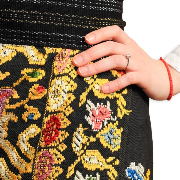 • Catrință purtată de o mireasă, lucrată manual în stative, având fondul negru din fir de bumbac și alesătură de mătase.
