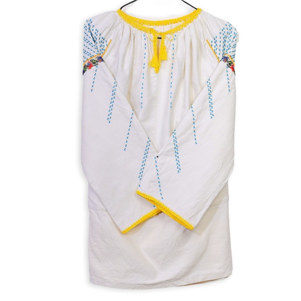 • Cămașă de damă cusută manual cu mărgele de sticlă, aplicate pe pânză de in, aplicate pe pânză de in, țesută în stative.