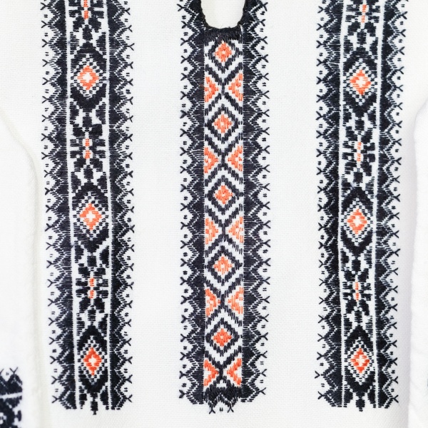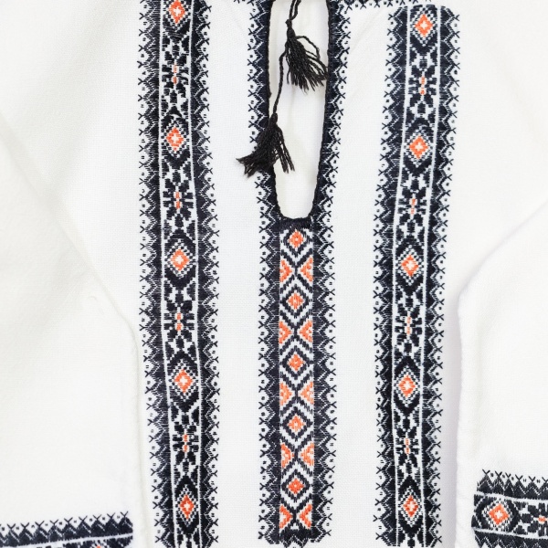 • Decorul geometric este foarte discret, fiind amplasat în acele locuri care simbolizează liniile croiului: la gura cămășii, în dreptul umerilor, la extremitatea mânecilor, pe poale și pe guler;
