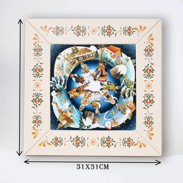 Tablou peisaj de iarna cu hora traditionala (decorat pe sticla cu rama din lemn)