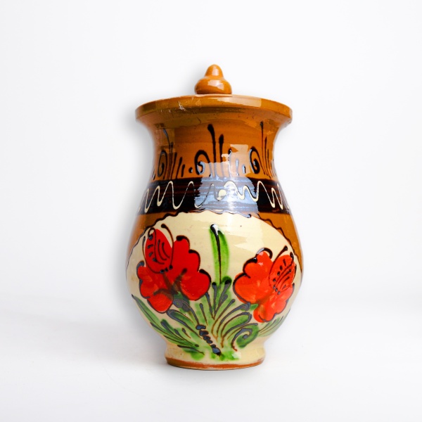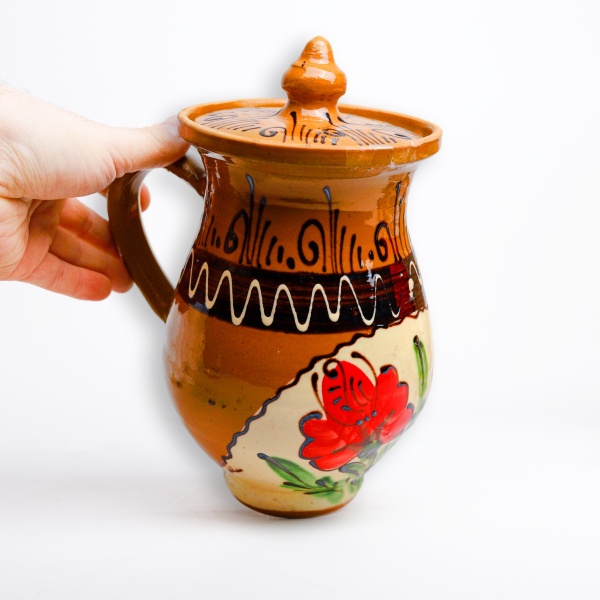 • Cană din Corund realizata manual din lut, decorată cu motive florale;
