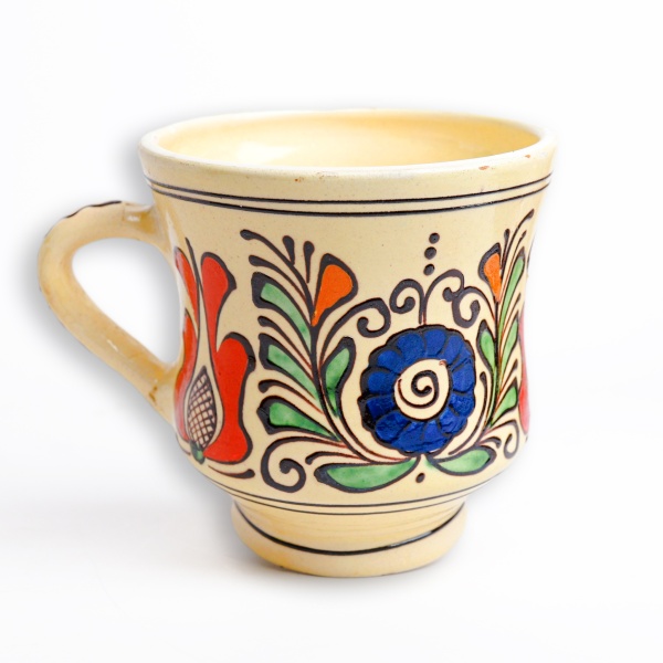 • Cană din ceramică în nuanțe de crem, roșu, verde și albastru, potrivită pentru vin, ceai sau cafea;